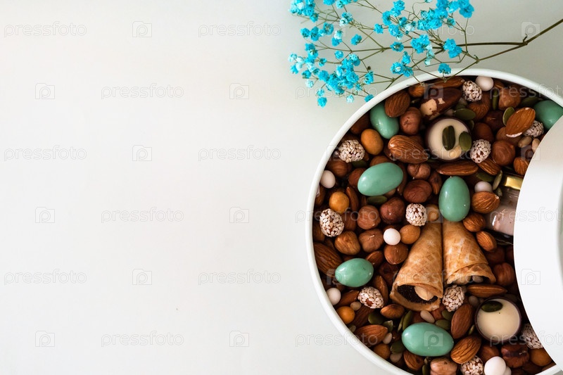 Арахис в коробке. Подарок к Женскому дню (8 марта), Женскому дню. День матери, День святого Валентина. Праздничная круглая коробочка