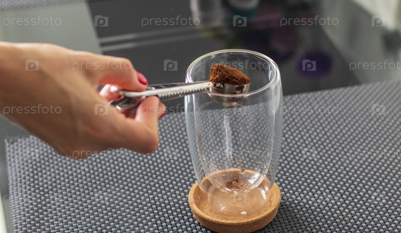 Снимок молотого кофе, добавляемого в прозрачную чашку для приготовления кофе. Напиток