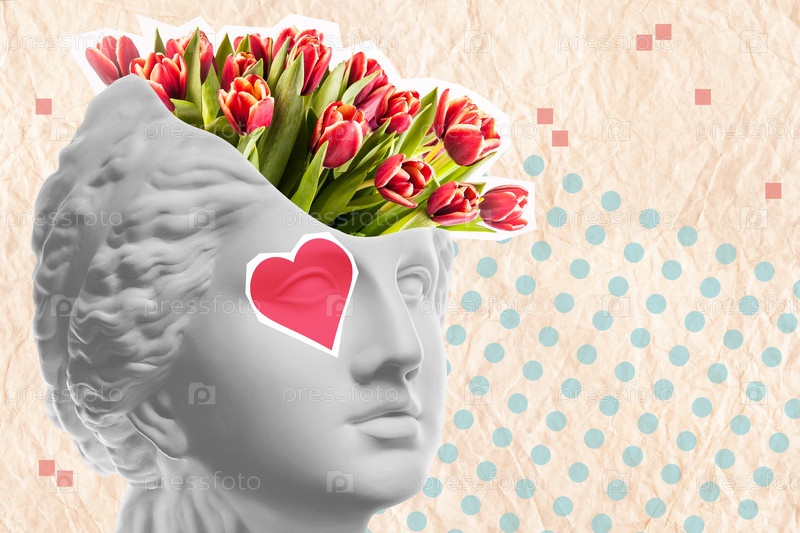 Плакат ко Дню святого Валентина 14 февраля, баннер, открытка, поздравления, журнал со старинным бюстом, сердце в милом дизайне. Романтические отношения, концепция любви с первого взгляда. Творческий коллаж