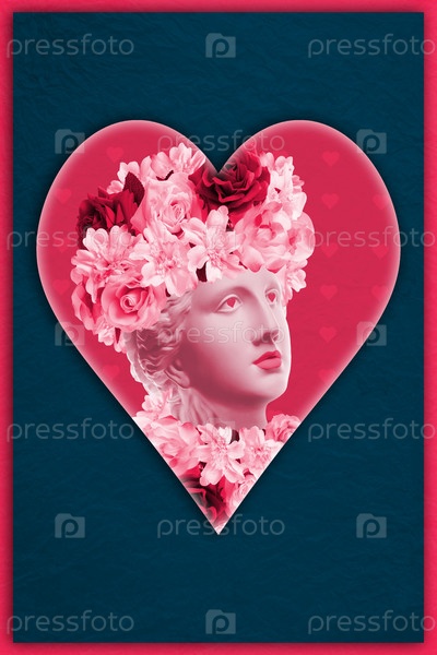 Плакат ко Дню святого Валентина 14 февраля, баннер, открытка, поздравления, журнал со старинным бюстом, сердце в милом дизайне. Романтические отношения, концепция любви с первого взгляда. Творческий коллаж
