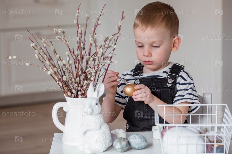 Маленький мальчик красит яйца в Чистый четверг к празднику. Готовим семью к Светлой Пасхе. В руках ребенка кисточка и яйцо