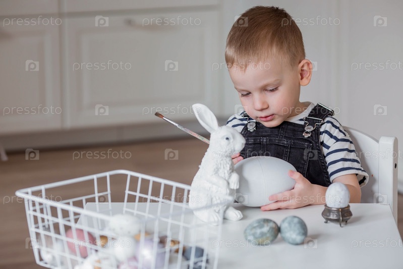 Маленький мальчик красит яйца в Чистый четверг к празднику. Готовим семью к Светлой Пасхе. В руках ребенка кисточка и яйцо