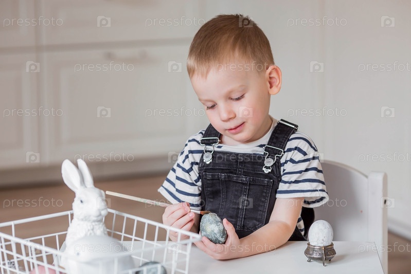 Маленький мальчик красит яйца в Чистый четверг к празднику. Готовим семью к Светлой Пасхе. В руках ребенка кисточка и яйцо