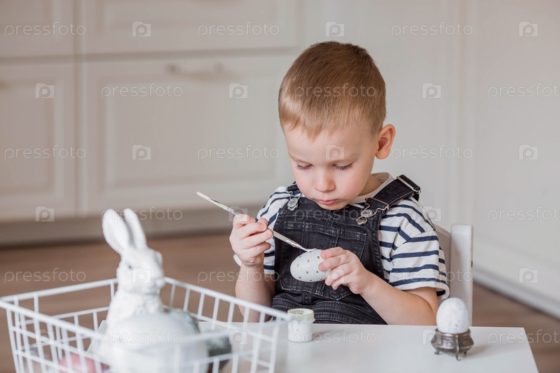 Маленький мальчик красит яйца в Чистый четверг к празднику. Готовим семью к Светлой Пасхе. В руках ребенка кисточка и яйцо