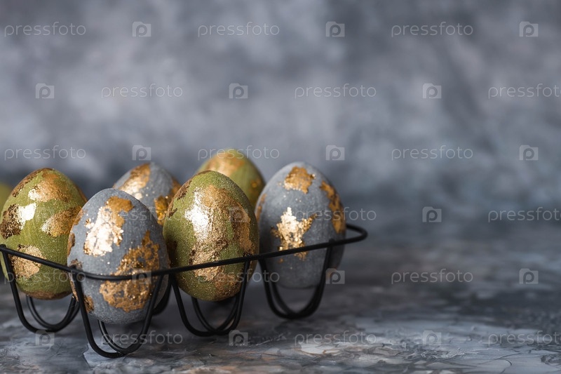 Стильные красивые пасхальные яйца с золотым покрытием из потали на сером фоне. Концепция счастливой Пасхи 2024