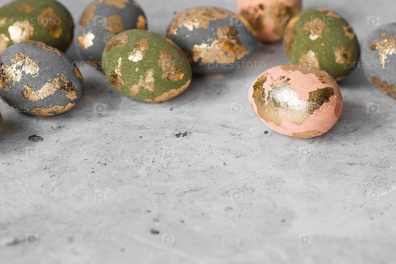 Стильные красивые пасхальные яйца с золотым покрытием из потали на сером фоне. Концепция счастливой Пасхи 2024