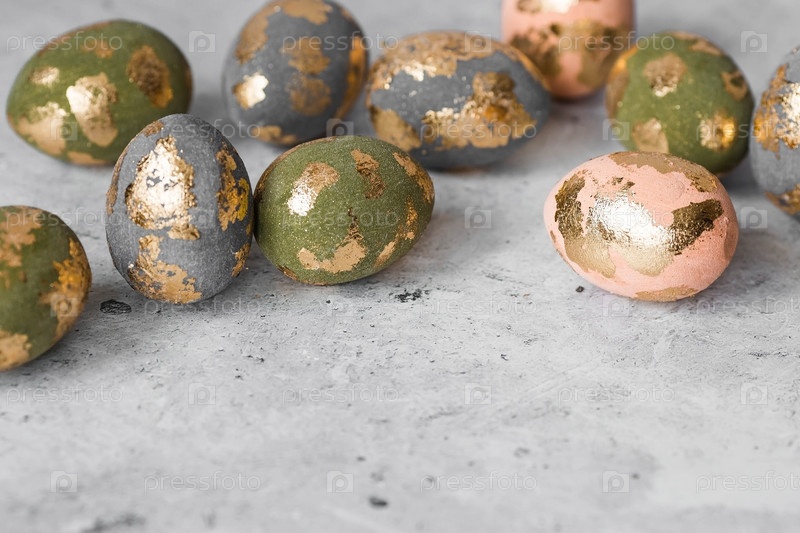 Стильные красивые пасхальные яйца с золотым покрытием из потали на сером фоне. Концепция счастливой Пасхи 2024