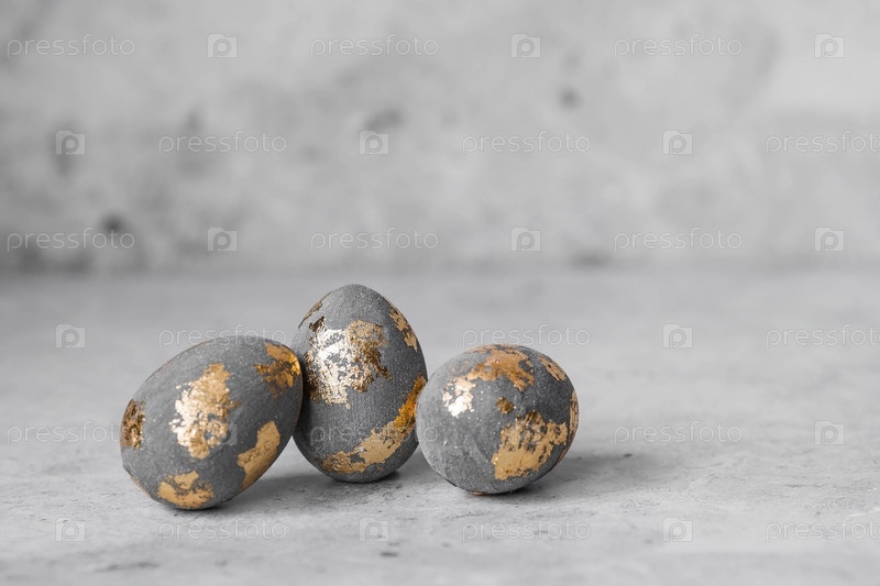 Стильные красивые серые пасхальные яйца с золотым покрытием из потали на сером фоне. Концепция счастливой Пасхи 2024