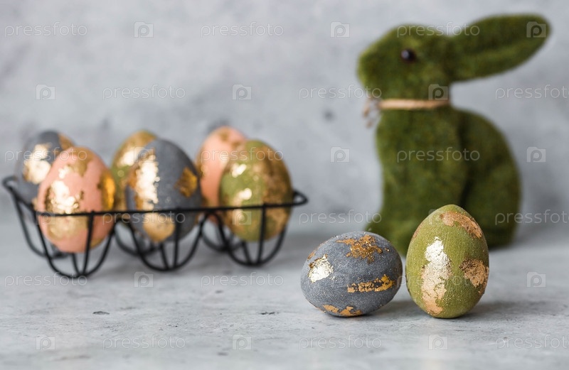 Стильные красивые пасхальные яйца с золотым покрытием из потали и пасхальный кролик на сером фоне. Концепция счастливой Пасхи 2024
