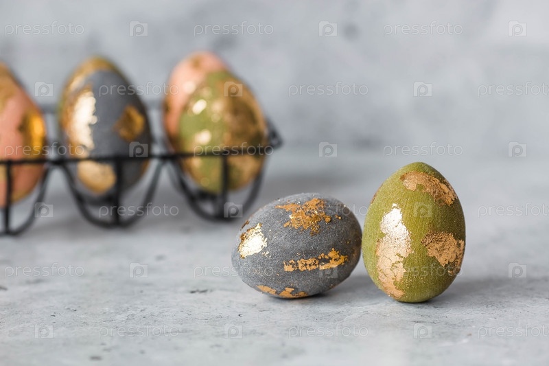 Стильные красивые пасхальные яйца с золотым покрытием из потали на сером фоне. Концепция счастливой Пасхи 2024