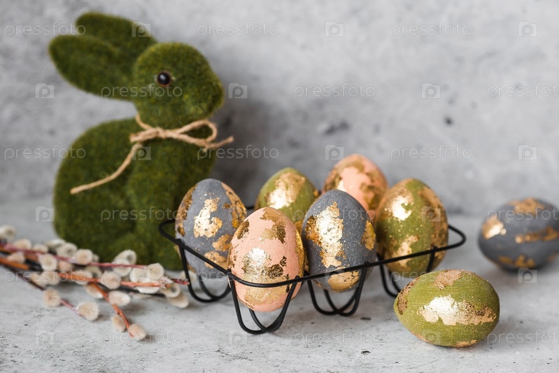 Стильные красивые пасхальные яйца с золотым покрытием из потали и пасхальный кролик на сером фоне. Концепция счастливой Пасхи 2024