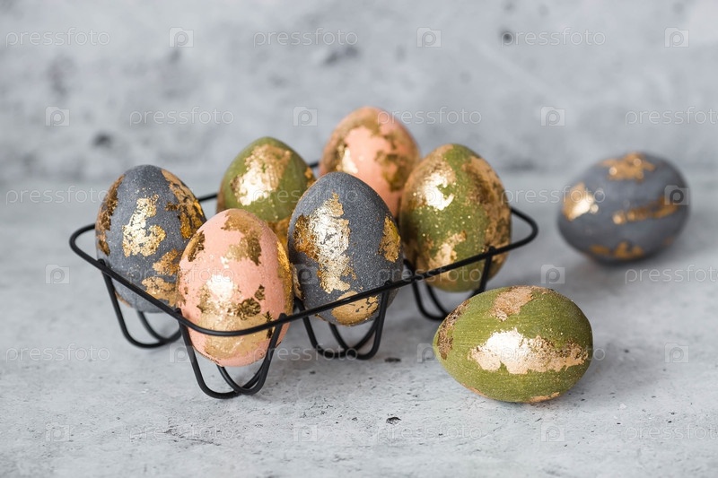 Стильные красивые пасхальные яйца с золотым покрытием из потали на сером фоне. Концепция счастливой Пасхи 2024