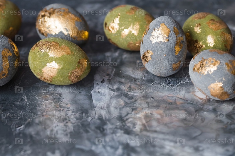 Стильные красивые пасхальные яйца с золотым покрытием из потали на сером фоне. Концепция счастливой Пасхи 2024