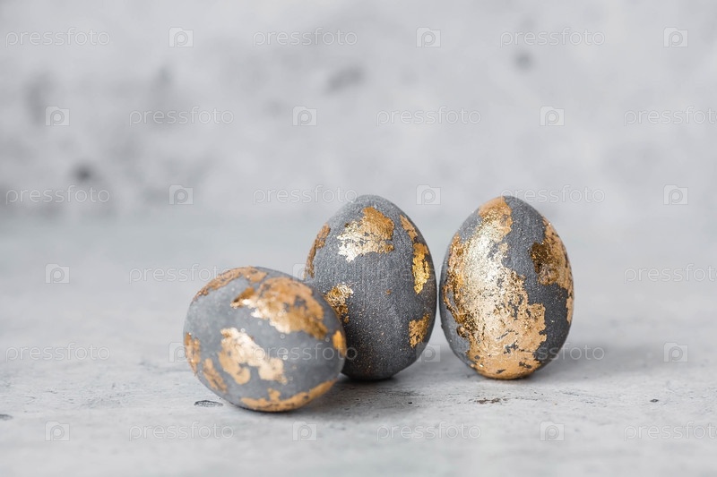 Стильные красивые серые пасхальные яйца с золотым покрытием из потали на сером фоне. Концепция счастливой Пасхи 2024