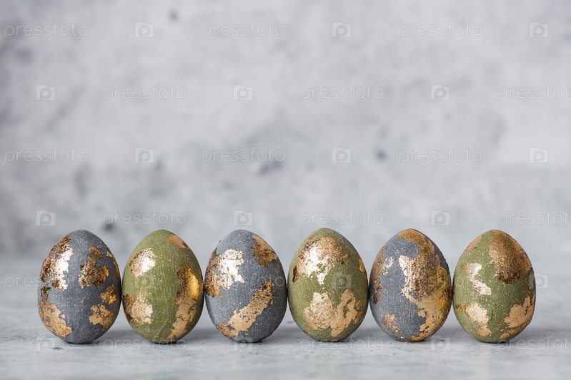 Стильные красивые пасхальные яйца с золотым покрытием из потали на сером фоне. Концепция счастливой Пасхи 2024