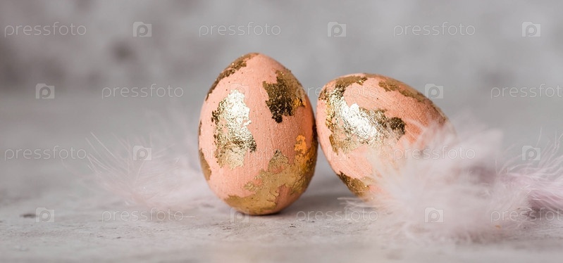 Стильные пасхальные яйца Peach Fuzz с покрытием золотой пот на сером фоне Концепция счастливой Пасхи 2024