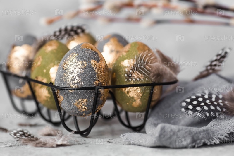 Стильные красивые пасхальные яйца с золотой эмалью, ветвями ивы и перьями на сером фоне. Концепция счастливой Пасхи 2024