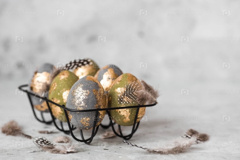 Стильные красивые пасхальные яйца с золотой эмалью и перьями на сером фоне. Концепция счастливой Пасхи 2024