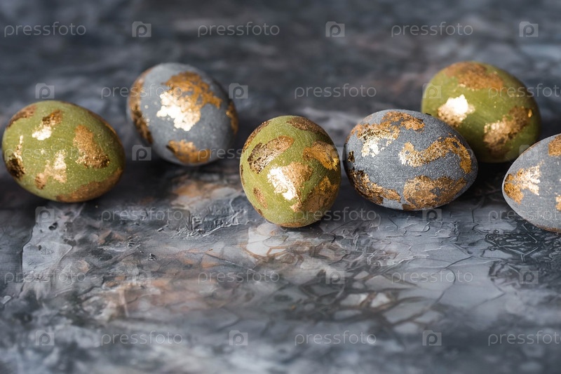 Стильные красивые пасхальные яйца с золотым покрытием из потали на сером фоне. Концепция счастливой Пасхи 2024