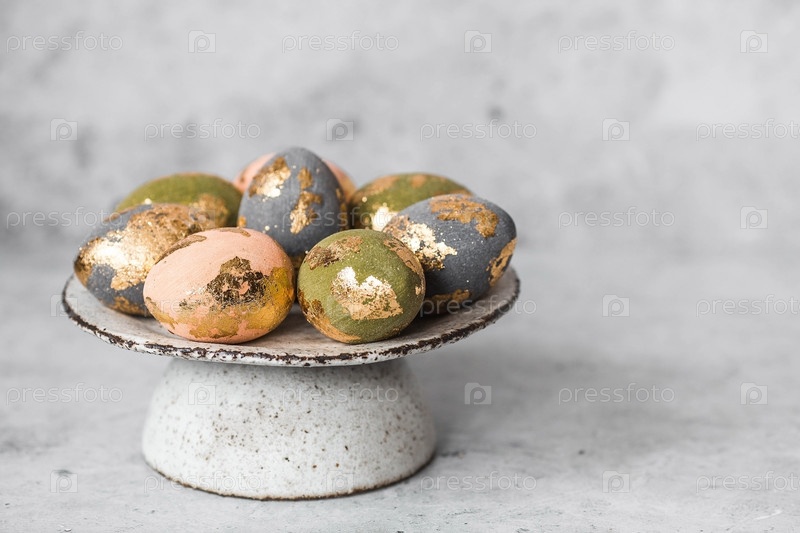 Красивые пасхальные яйца с золотым покрытием были положены на стальную бетонную плиту на сером фоне. Концепция счастливой Пасхи 2024