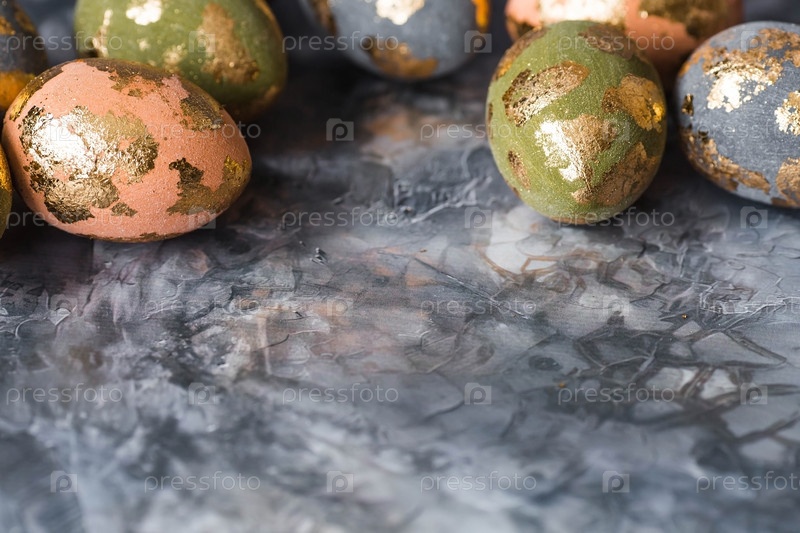 Стильные красивые пасхальные яйца с золотым покрытием из потали на сером фоне. Концепция счастливой Пасхи 2024