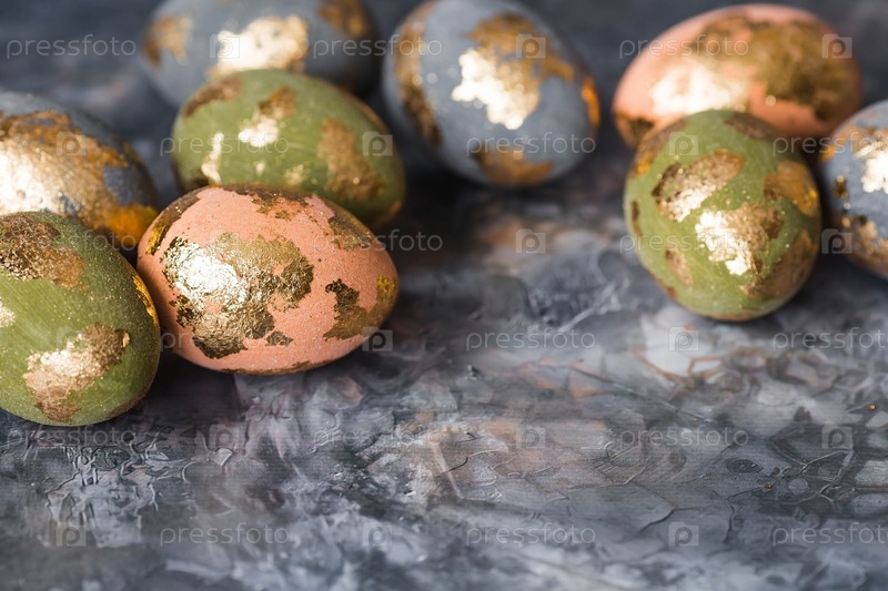 Стильные красивые пасхальные яйца с золотым покрытием из потали на сером фоне. Концепция счастливой Пасхи 2024