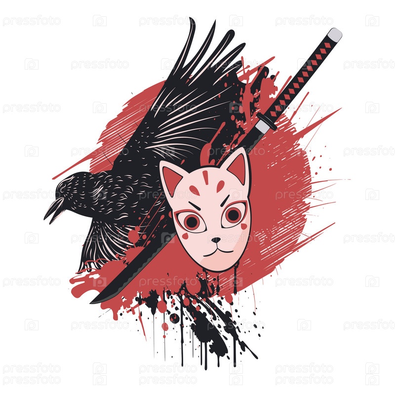 Ворона, маска кицунэ и катана