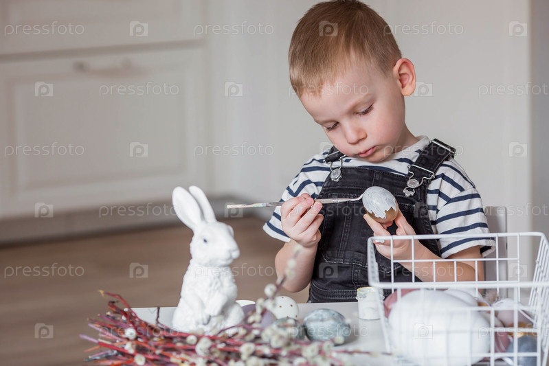 Маленький мальчик красит яйца в Чистый четверг к празднику. Готовим семью к Светлой Пасхе. В руках ребенка кисточка и яйцо