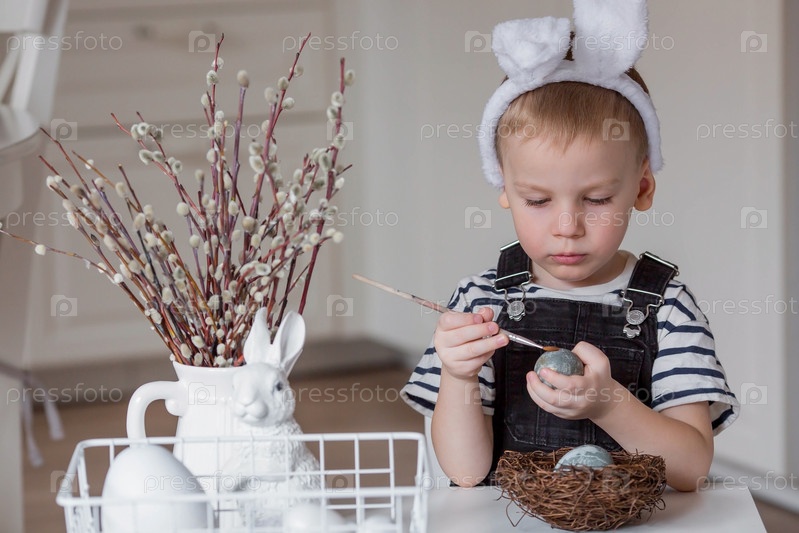 Маленький мальчик красит яйца в Чистый четверг к празднику. Готовим семью к Светлой Пасхе. В руках ребенка кисточка и яйцо