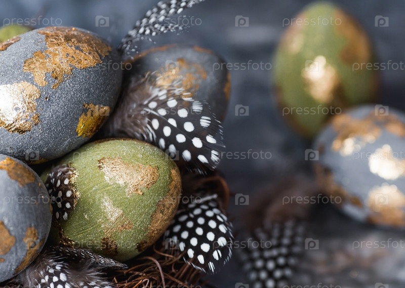 Стильные красивые пасхальные яйца с золотым покрытием из пота и перьев в птичьем гнезде из хвороста на сером фоне. Концепция счастливой Пасхи 2024