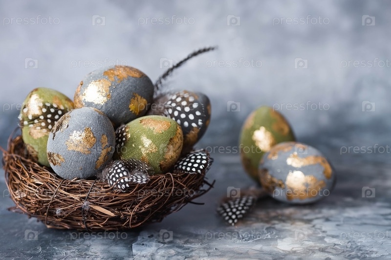 Стильные красивые пасхальные яйца с золотым покрытием из пота и перьев в птичьем гнезде из хвороста на сером фоне. Концепция счастливой Пасхи 2024