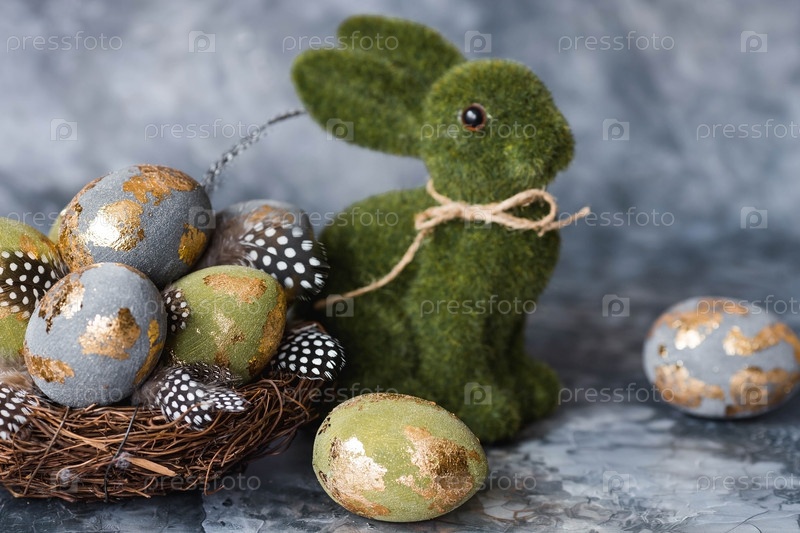 Стильные красивые пасхальные яйца с золотым покрытием из потали и пасхальный кролик на сером фоне. Концепция счастливой Пасхи 2024