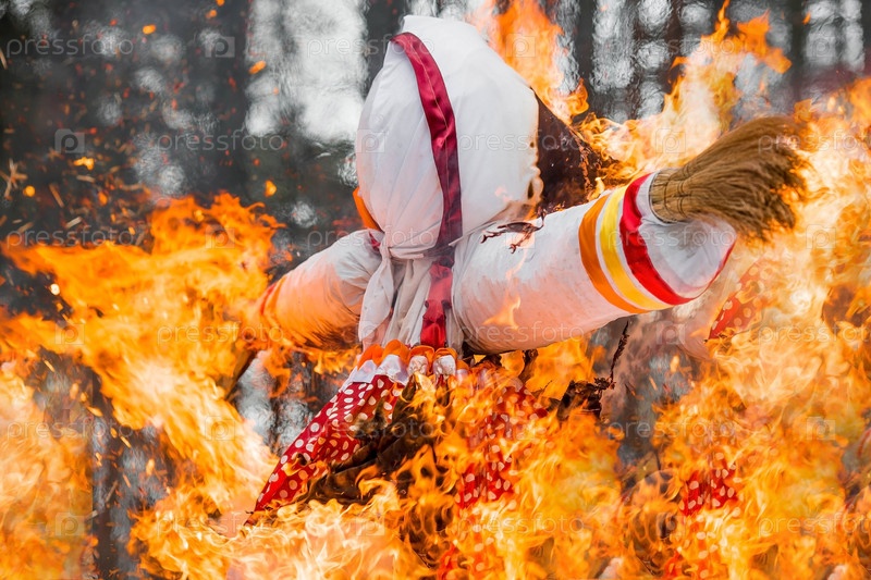 Русские традиции. Праздник Широкая Масленица. Сожжение чучела Масленицы в Подмосковье. Проводы зимы