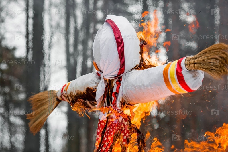 Русские традиции. Праздник Широкая Масленица. Сожжение чучела Масленицы в Подмосковье. Проводы зимы