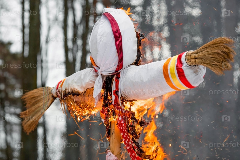 Русские традиции. Праздник Широкая Масленица. Сожжение чучела Масленицы в Подмосковье. Проводы зимы