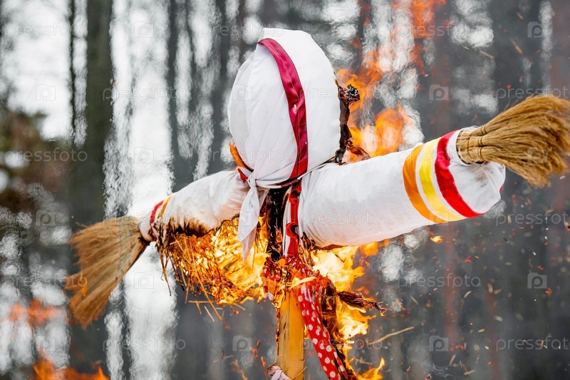 Русские традиции. Праздник Широкая Масленица. Сожжение чучела Масленицы в Подмосковье. Проводы зимы