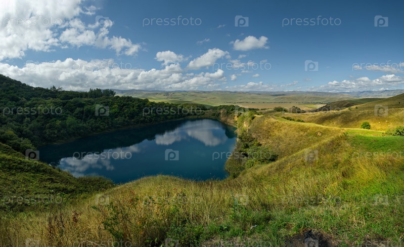 Россия. Кабардино-Балкария. Вид на карстовые глубоководные озера с голубой водой и крутыми берегами, на которых были съемки фильма "Земля Санникова"