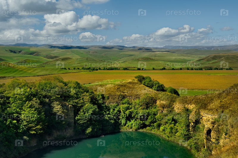 Россия. Кабардино-Балкария. Вид на карстовые глубоководные озера с голубой водой и крутыми берегами, на которых были съемки фильма "Земля Санникова"