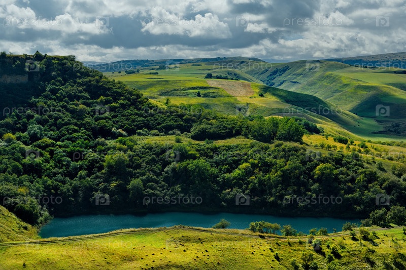 Россия. Кабардино-Балкария. Вид на карстовые глубоководные озера с голубой водой и крутыми берегами, на которых были съемки фильма "Земля Санникова"