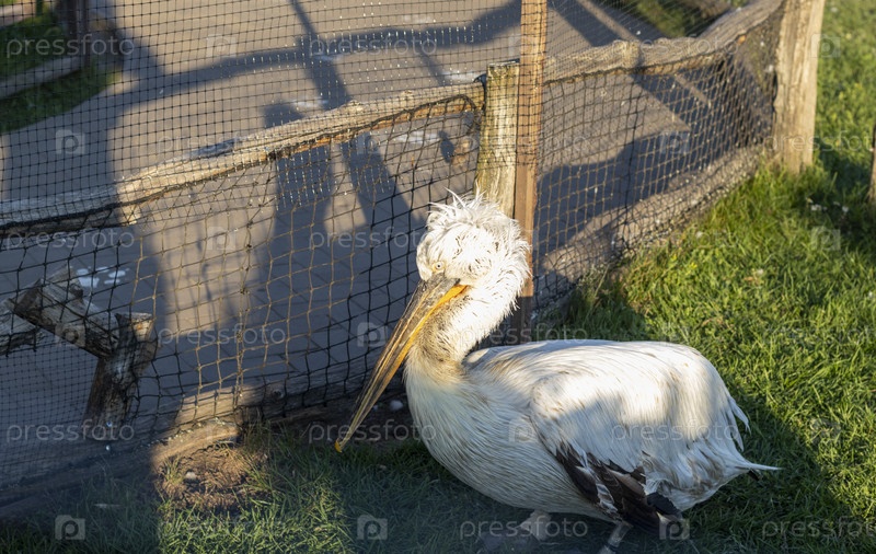 Общий план пеликана в клетке в зоопарке. Пернатый