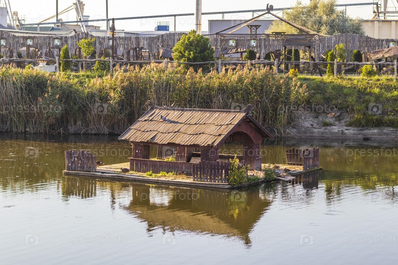 Снимок деревянной ондатры и кормушки для птиц на берегу реки. Деревня