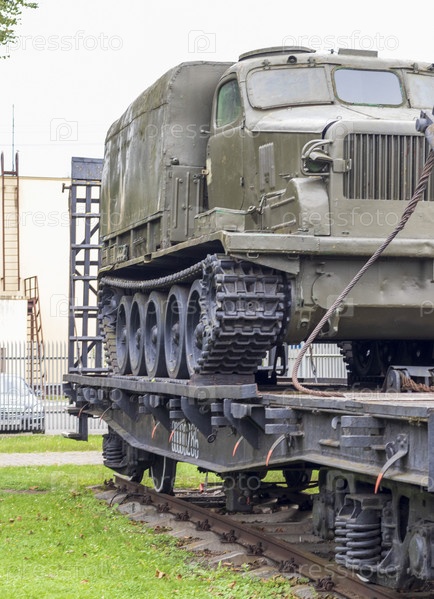 Снимок винтажного старого строительного поезда, перевозящего военную грузовую машину. Военный