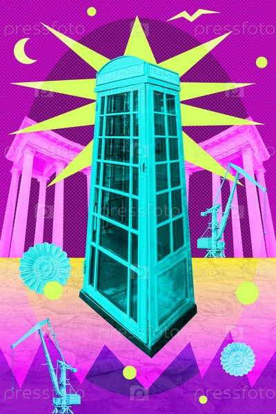 Причудливый коллаж в стиле поп-арт с телефонной будкой и деталями классической архитектуры в неоновых тонах. Современные обои городского пейзажа в стиле ретро. Шаблон современного сюрреалистического плаката, обложки, наклейки, открытки