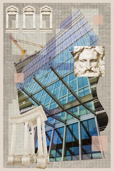 Смешанный промышленный фон современной и исторической архитектуры. Сюрреалистический арт-коллаж с элементами классических архитектурных деталей, античных статуй, фасадов новых зданий, строительных площадок