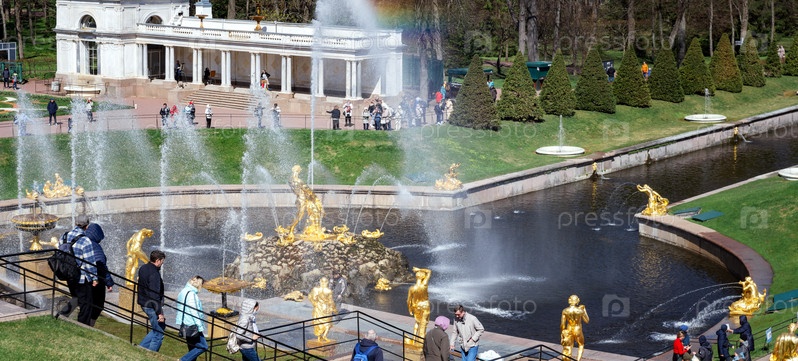Вид на фонтанный комплекс Петергофского дворца в мае