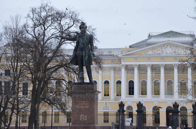 Памятник поэту Александру Сергеевичу Пушкину (скульптор Аникушин) в Михайловском сквере на площади Искусств в Санкт-Петербурге на фоне Михайловского дворца (Русский музей)