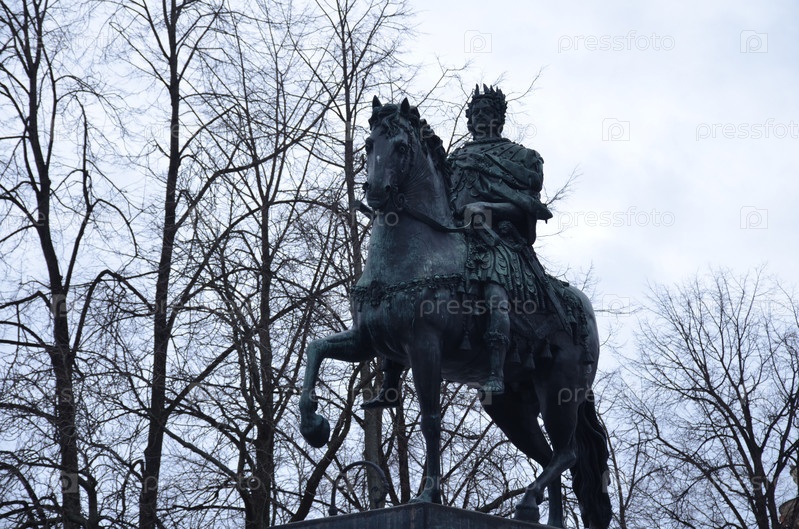 Памятник императору Петру I у инженерного (Михайловского) замка Санкт-Петербурга зимой в пасмурный день