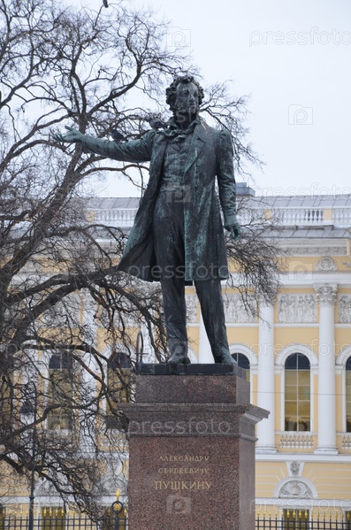 Памятник поэту Александру Сергеевичу Пушкину (скульптор Аникушин) в Михайловском сквере на площади Искусств в Санкт-Петербурге на фоне Михайловского дворца (Русский музей)