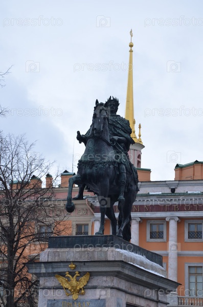 Памятник императору Петру I у инженерного (Михайловского) замка Санкт-Петербурга зимой в пасмурный день