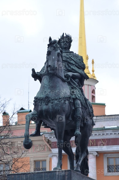 Памятник императору Петру I у инженерного (Михайловского) замка Санкт-Петербурга зимой в пасмурный день